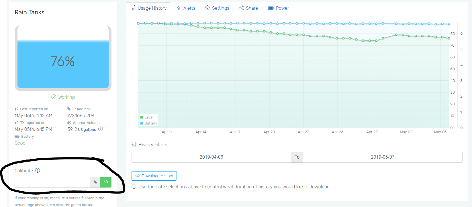 First press the “Connect” button on the transmitter and refresh your browser. This obtains the latest level reading online before calibrating.